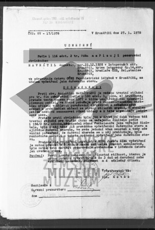 Usnesení o nařízení ústavního pozorování Augustina Navrátila v Psychiatrické léčebně v Kroměříži, leden 1978.