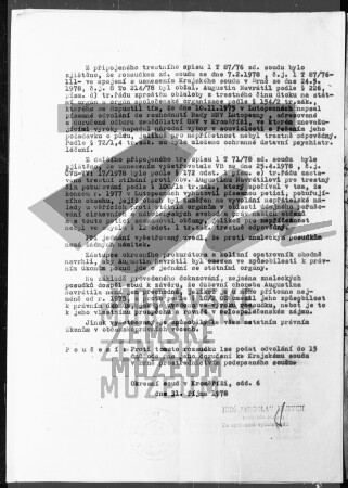 Rozsudek ČSSR - omezení Augustina Navrátila ve způsobilosti k právním úkonům (podávání návrhů a podnětů státním orgánům a institucím a samostatné jednání s nimi) pro duševní chorobu, jež není jen přechodná, říjen 1978.