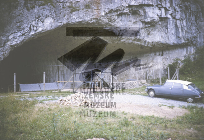 Pracoviště v jižním vchodu jeskyně. Diapozitiv