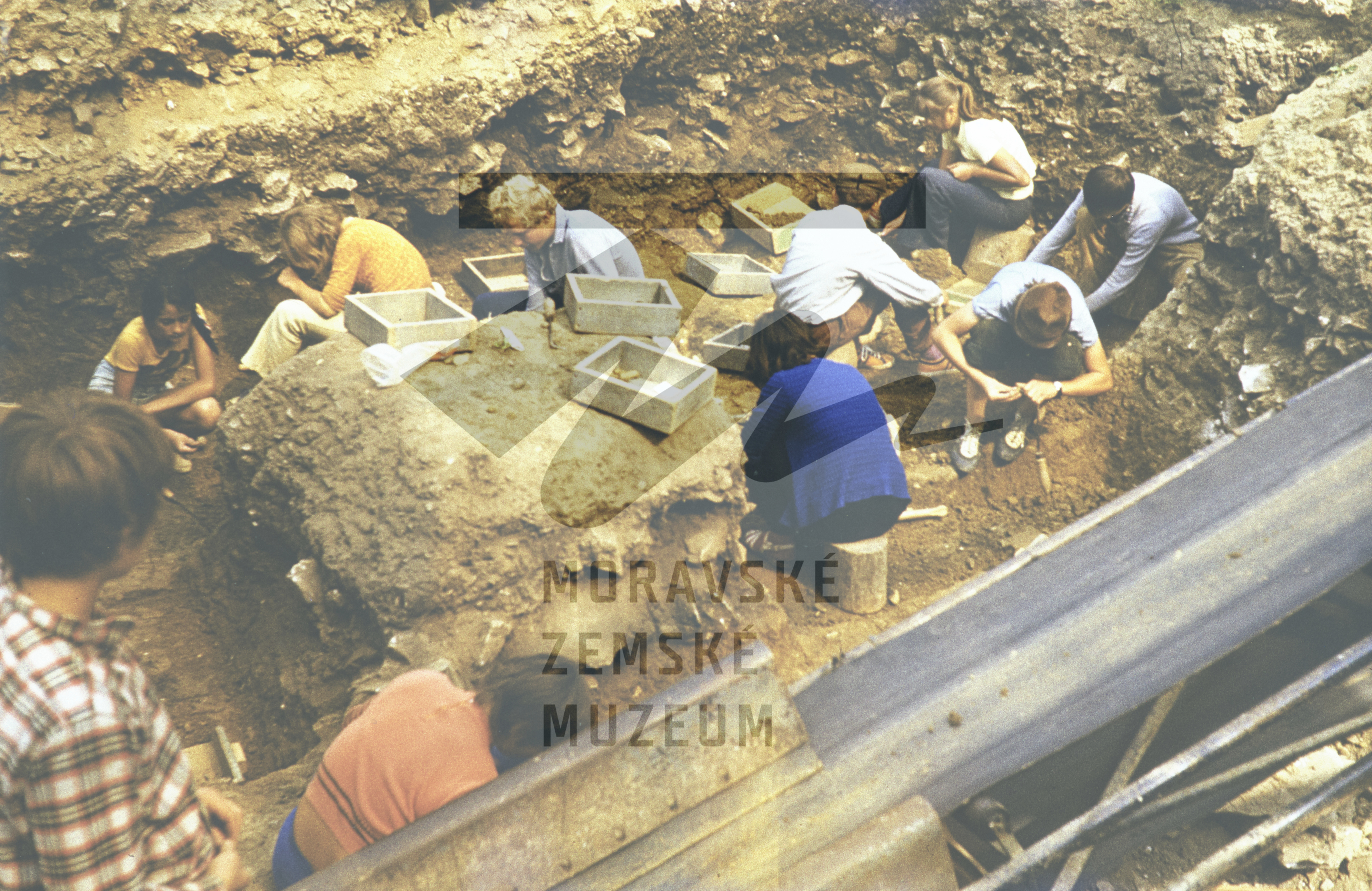 Výzkum v předpolí jeskyně (jižní portál). Diapozitiv, 1976.
