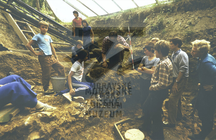 Výzkum 1976 před jeskyní;  uprostřed Vilém Gebauer, zcela napravo mladý M. Oliva (?). Diapozitiv 1976.