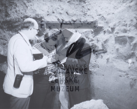 Komise při nálezu čelisti 1965; diapozitiv. Uprostřed Jelínek (černý oblek), Tobias v košili, za Jelínkem V. Gebauer.