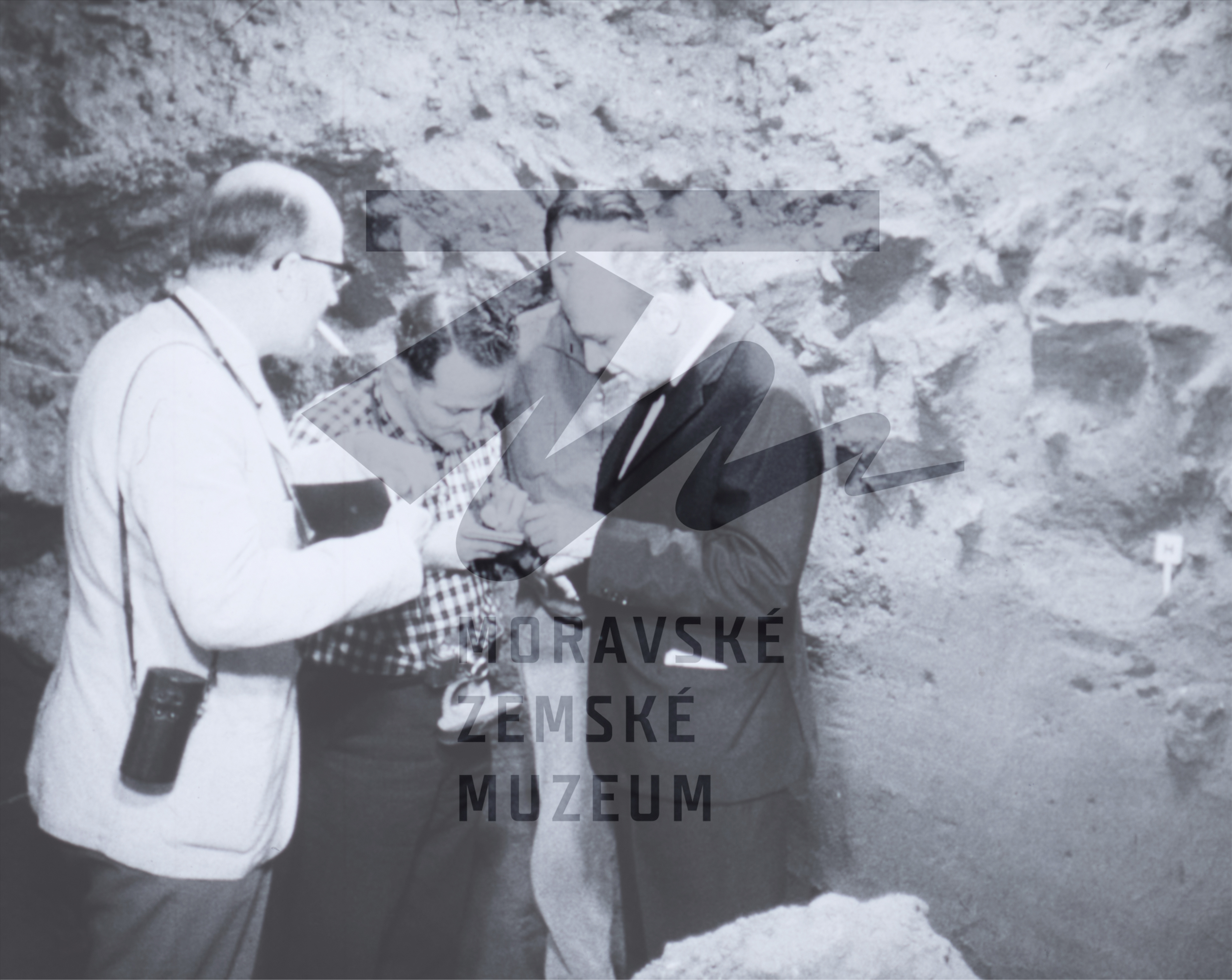 Komise při nálezu čelisti 1965; diapozitiv. Uprostřed Jelínek (černý oblek), Tobias v košili, za Jelínkem V. Gebauer.