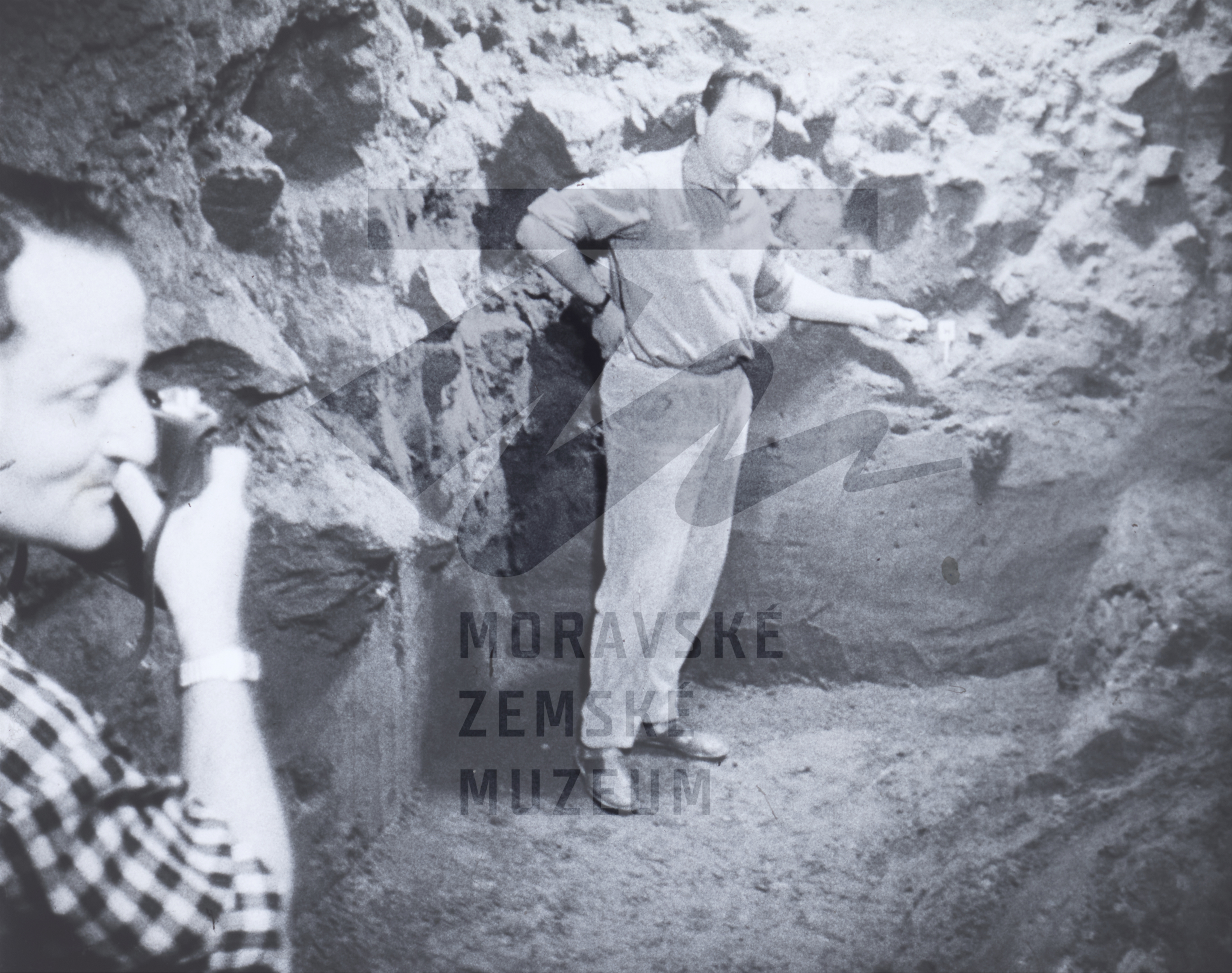 Profil A/29 s nálezem neandertálské čelisti. V Gebauer drží čelist v poloze nálezu a Tobias fotografuje. 1965; diapozitiv.