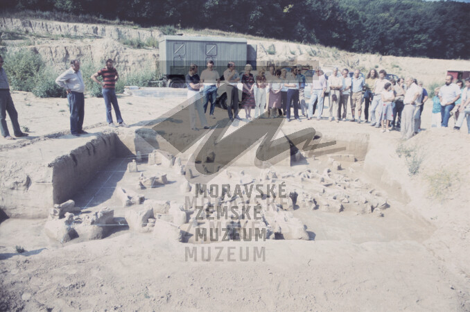 Komise na výzkumu gravettienské vrstvy. Karel Novák (druhý zleva), Oldřich Kroupa (třetí zleva), M. Oliva (vpravo v bílé košili s rukou v bok).