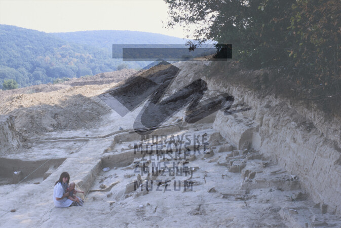 Výzkum gravettienské vrstvy v nejvyšší části lokality na hranici lesa. Rozptýlené mamutí kosti.