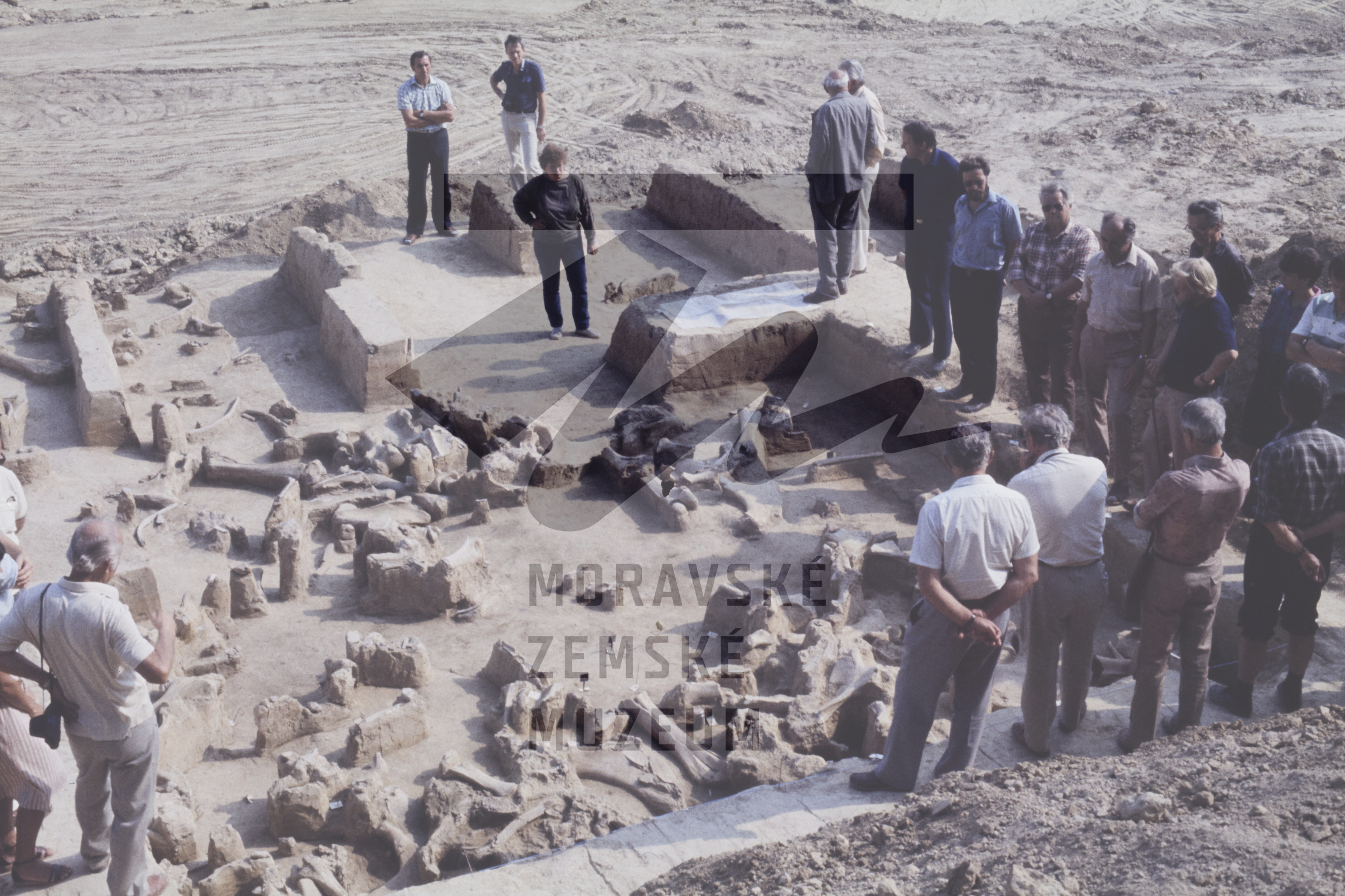 Odborná komise u akumulace kostí v sektoru G, reprezentující základ chaty. M. Oliva v tmavě modré košili s hůlkou.