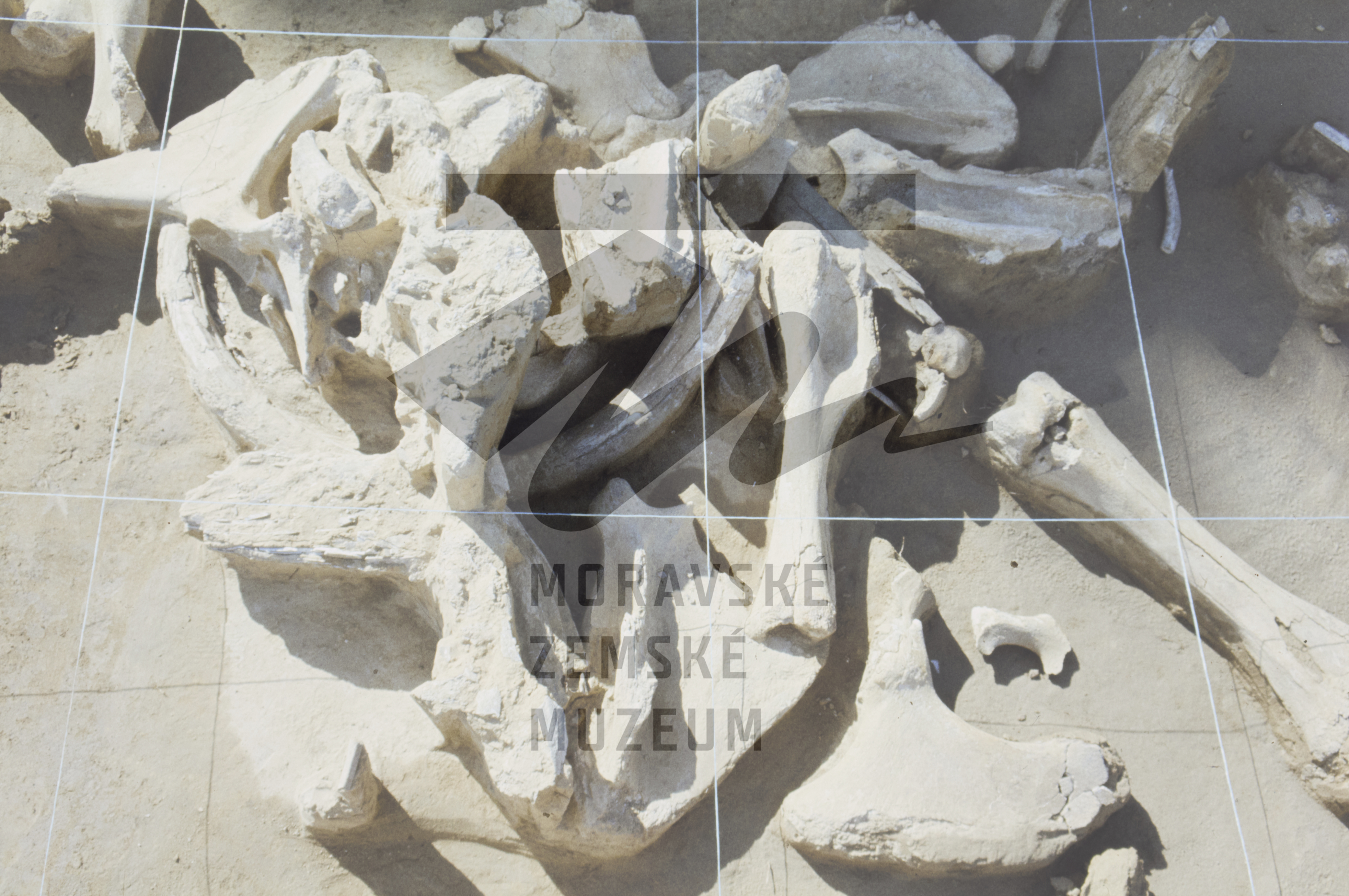 Akumulace mamutích kostí v gravettienské kulturní vrstvě.