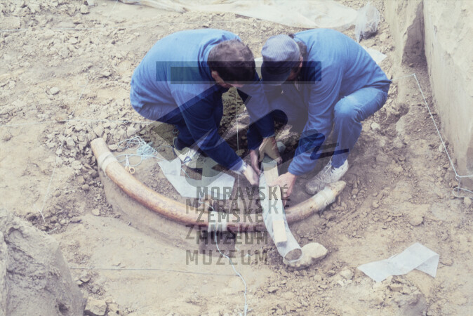 Vyzvedávání mamutích klů z gravettienské kulturní vrstvy.