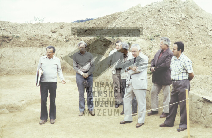 Komise na výzkumu. Zleva K. Valoch, K. Sklenář, J. Kovárník, Ondruš, J. Poulík.