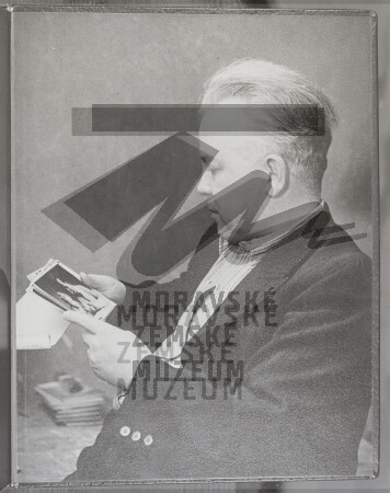 František Halas z profilu, sedící a prohlížející fotografie, rok 1948